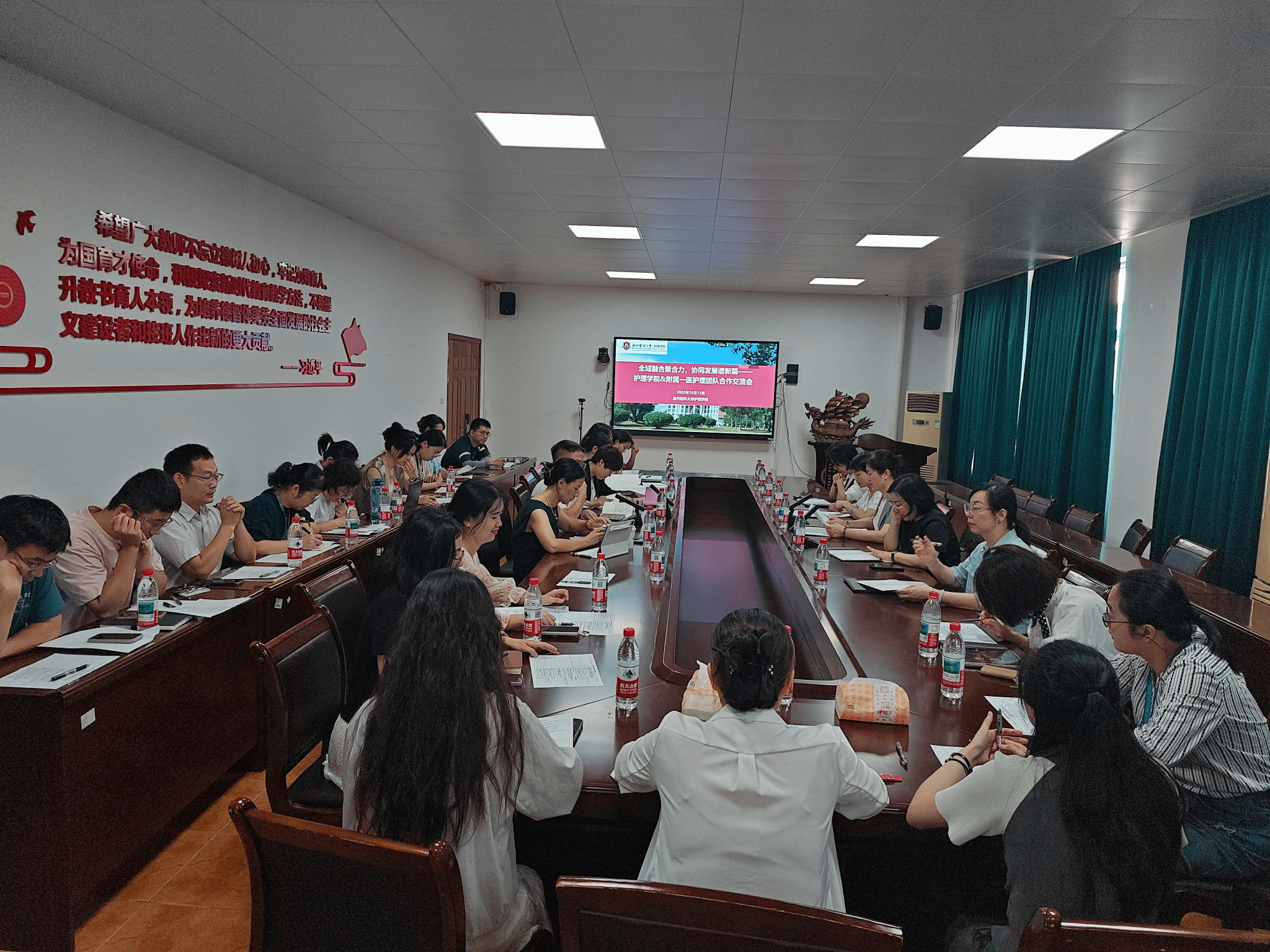 To thoroughly implement the national strategic deployment of "integration of medical education", address the disconnect between nursing clinical practice and teaching-research, and promote the high-quality development of the nursing discipline in our university, the School of Nursing and the First Affiliated Hospital (hereinafter referred to as "the First Affiliated Hospital") held a "Medical-Educational-Research Collaborative Alignment Meeting" on October 13, 2025. Attendees included Cai Fuman, Dean of the School of Nursing; Huang Xiaoqiong and Dong Chaoqun, Vice Deans of the School of Nursing; Xu Xiaoqun, Director of the Nursing Department of the First Affiliated Hospital; Xia Limin, Deputy Director of the Nursing Department of the First Affiliated Hospital; 12 members of the hospital’s core nursing team; and 15 representatives of key young teachers from the School of Nursing, including doctors and postdoctoral researchers newly recruited in recent years. The meeting was presided over by Vice Dean Dong Chaoqun.