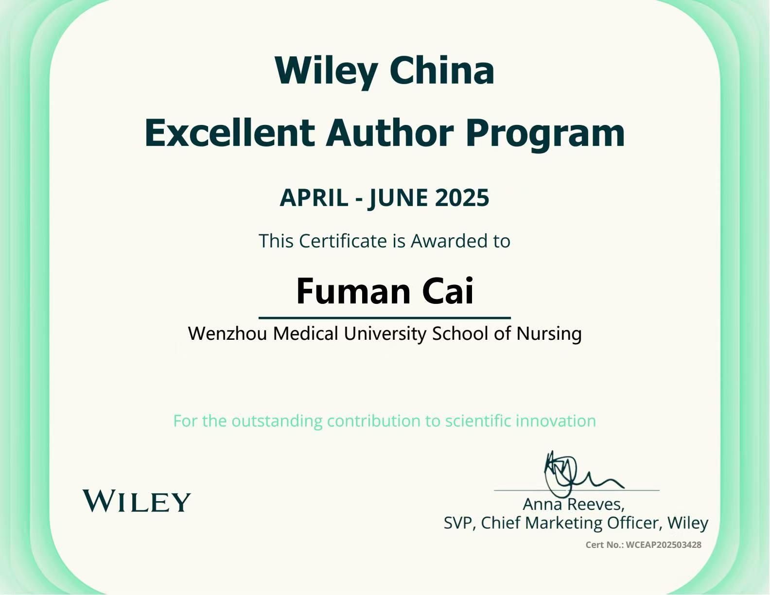 A paper titled "Interpretable Machine Learning Prediction Model for Predicting Mortality Risk of ICU Patients With Pressure Ulcers Based on the Braden Scale: A Clinical Study Based on MIMIC‐IV", which was published in the Journal of Clinical Nursing, has garnered widespread attention from scholars worldwide immediately after its release. With Chen Binyan, Zhou Jinghao and Chen Shengzhang (Grade 2024 Master’s students of Nursing from our school) as co-first authors, and Professor Cai Fuman and Dr. Huang Pan as co-corresponding authors, the paper achieved 334 downloads within three months and ranked among the top articles published in the journal in Q2 2025. For these outstanding achievements, the research team was awarded the "2025 Q2 Wiley China Highly Cited Author Award", demonstrating the far-reaching international academic influence of this study.