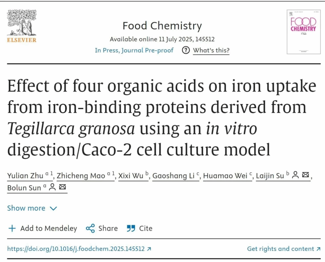 Recently, two second-year undergraduate students majoring in Nursing from our school, Zhu Yulian and Mao Zhicheng, published a research article titled "Effect of four organic acids on iron uptake from iron-binding proteins derived from Tegillarca granosa using an in vitro digestion/Caco-2 cell culture model" in Food Chemistry, a top international journal of nutrition (CAS Category 1 TOP, IF=9.8), as the first author and co-first author respectively. The article was supervised by Dr. Sun Bolun, a young teacher newly recruited by our school in recent years.