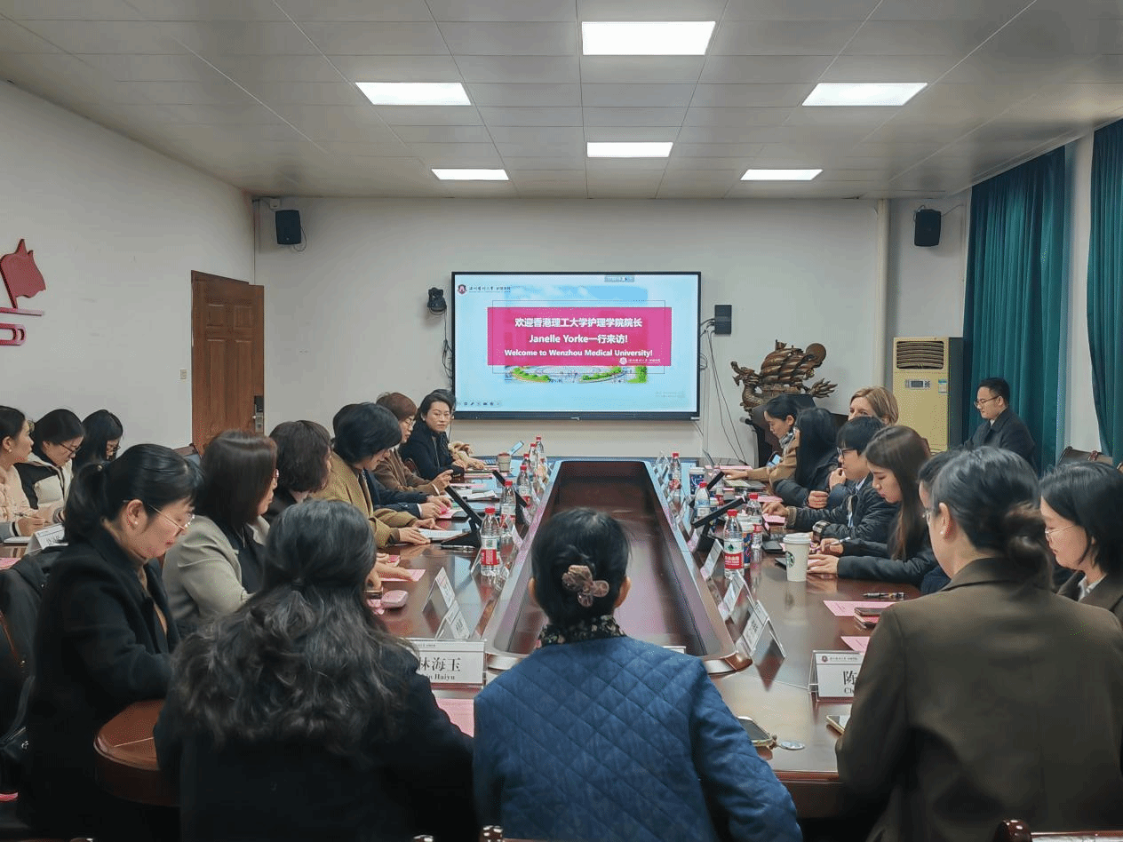 On the morning of January 26, 2026, Conference Room 7C306, School of Nursing, Chashan Campus, Wenzhou Medical University was filled with warmth and distinguished guests. A delegation of four led by Professor Janelle Yorke, Dean of the School of Nursing, The Hong Kong Polytechnic University, visited Wenzhou Medical University to conduct in-depth academic cooperation and exchanges with the School of Nursing and nursing teams from its affiliated hospitals, and a grand appointment ceremony for Visiting Professor was held.At the ceremony, Dean Janelle Yorke, on behalf of The Hong Kong Polytechnic University, awarded the Visiting Professor appointment certificate to Professor Cai Fuman, Dean of the School of Nursing, Wenzhou Medical University, in recognition of his outstanding academic achievements and leading role in the field of chronic wound care, injecting strong new momentum into the cooperative development of nursing disciplines between the two universities. The event was presided over by Professor Dong Chaoqun, Vice Dean of the School of Nursing. Also in attendance were Professor Huang Xiaoqiong, Vice Dean, Ms. Chen Yu, Deputy Director of the Nursing Department of the First Affiliated Hospital, Ms. Zhuge Linmin, Deputy Director of the Nursing Department of the Second Affiliated Hospital, and more than 30 nursing faculty members and clinical nurses.